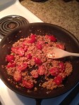 - Reduce heat to medium and add the tomatoes and garlic to the sausage.