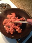 - Add the sausage and break into small chunks with the back of a wooden spoon.