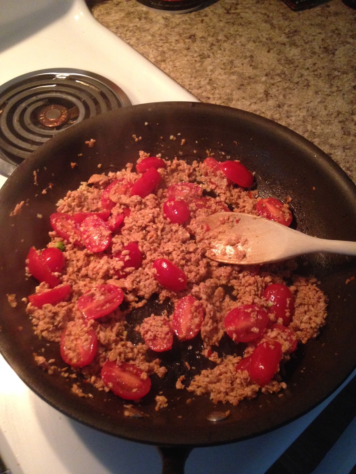 Reduce heat to medium and add the tomatoes and garlic to the sausage.