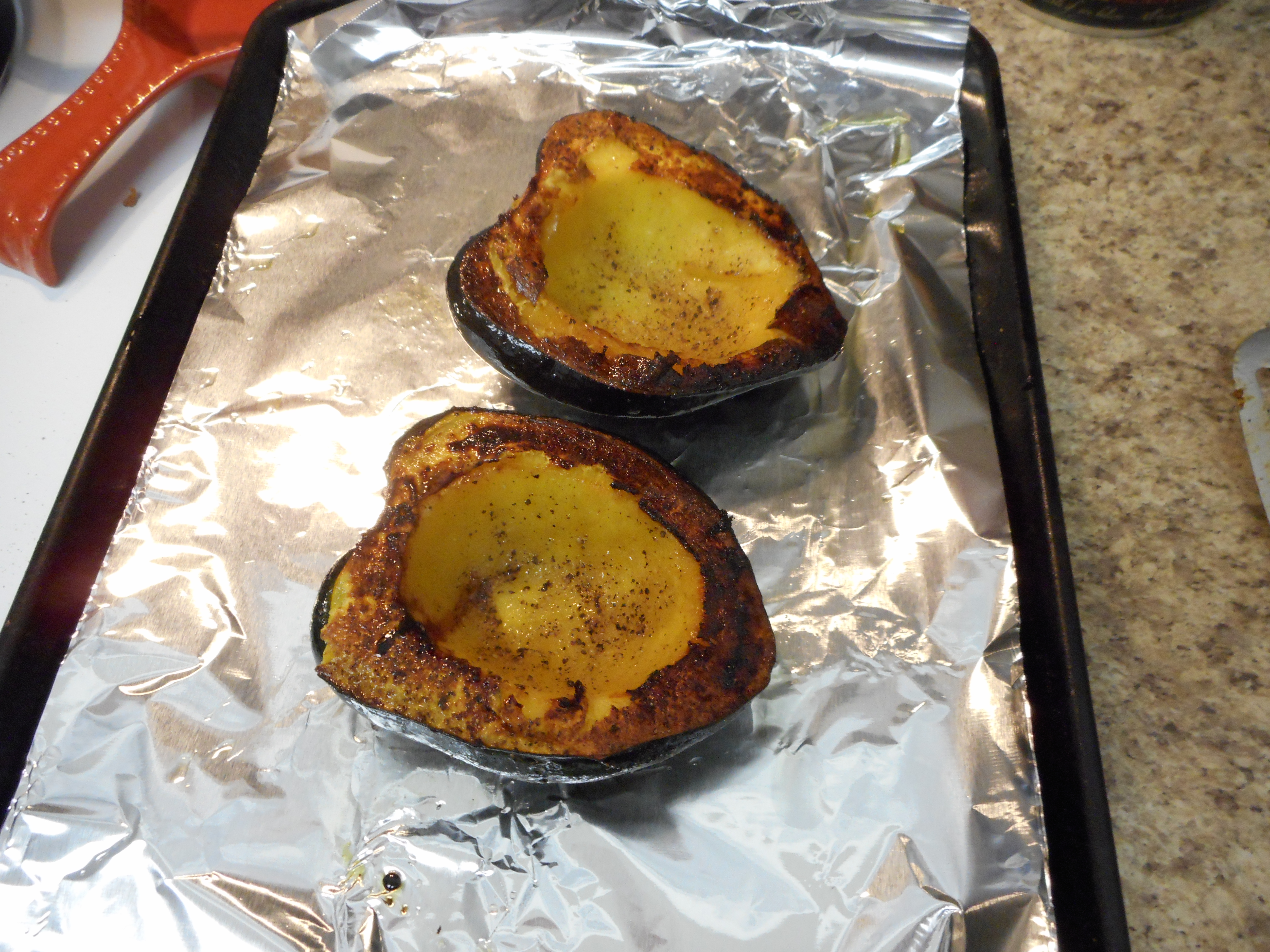 ← Previous Next → Stuffed Acorn Squash 016 Remove the squash from the oven and turn over. The inside will have nice caramelization.