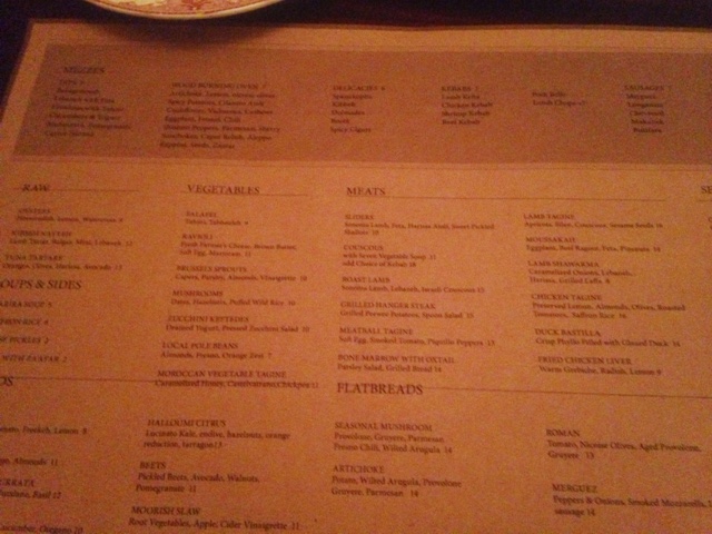 Now, for those of you are not familiar with Tapas Style establishments – Tapas Style just means that you and whomever you are with order various small plates of food to share; enjoying many little bites of different types of foods and lots of different flavors to comprise your entire meal. I love eating Tapas style; you get to try more dishes and enjoy more flavors which is fun and for a cook, inspiring. Cleo offers an expansive Tapas menu: dips and salads, wood-fired vegetable dishes and other veggie concoctions, gourmet flatbreads and pizzettes, kabobs and exotic sausages, and masterfully created meats and seafood dishes. There is really something for everyone here and everything seems to be gourmet and quality. As the menu is divided into different sections like: vegetables, seafood, meat, flatbreads, etc. I suggest that you pick four to five sections and then order one dish from each of those sections to really sample of the different flavors and styles.
