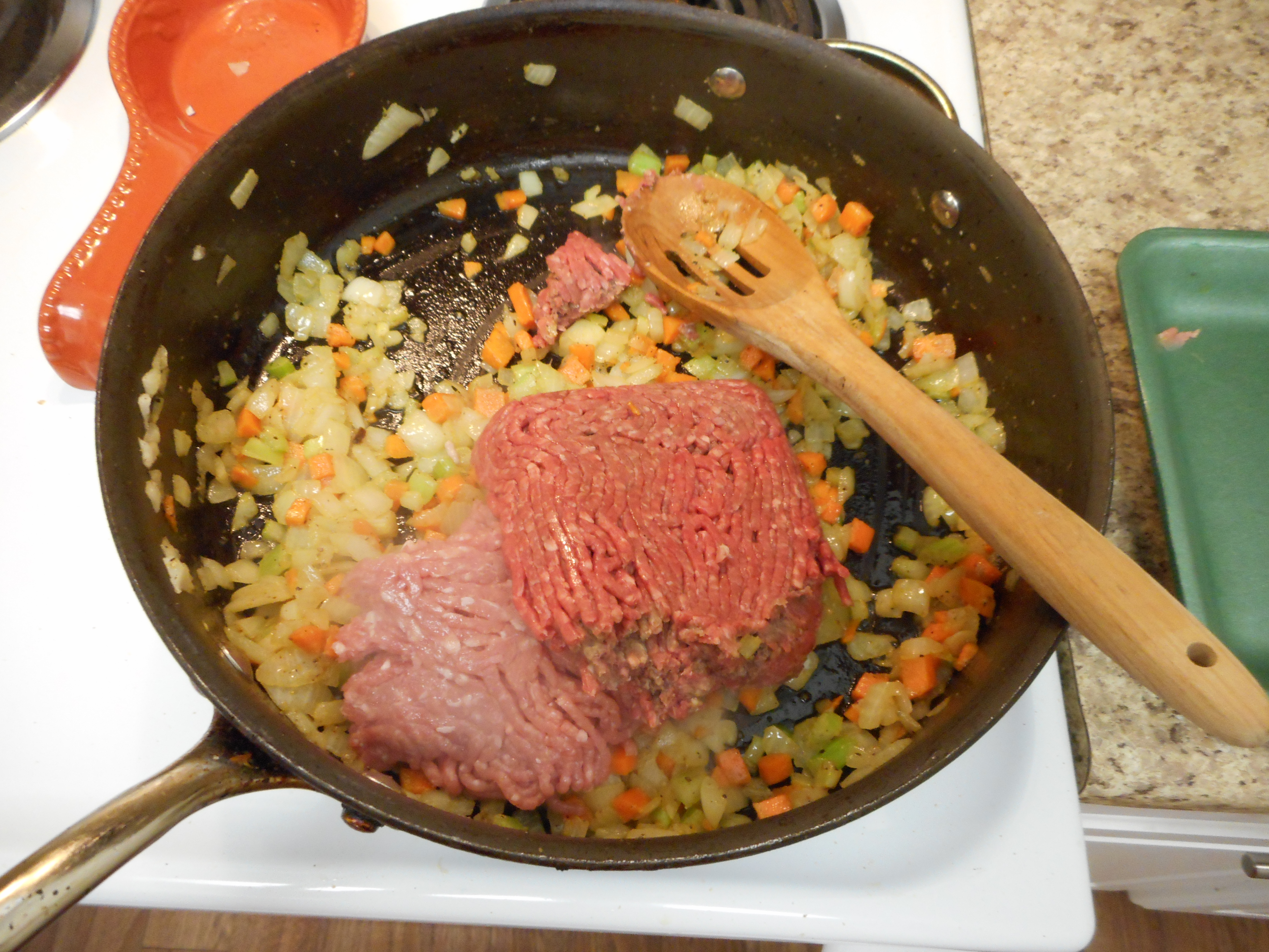 Add the pork and beef.