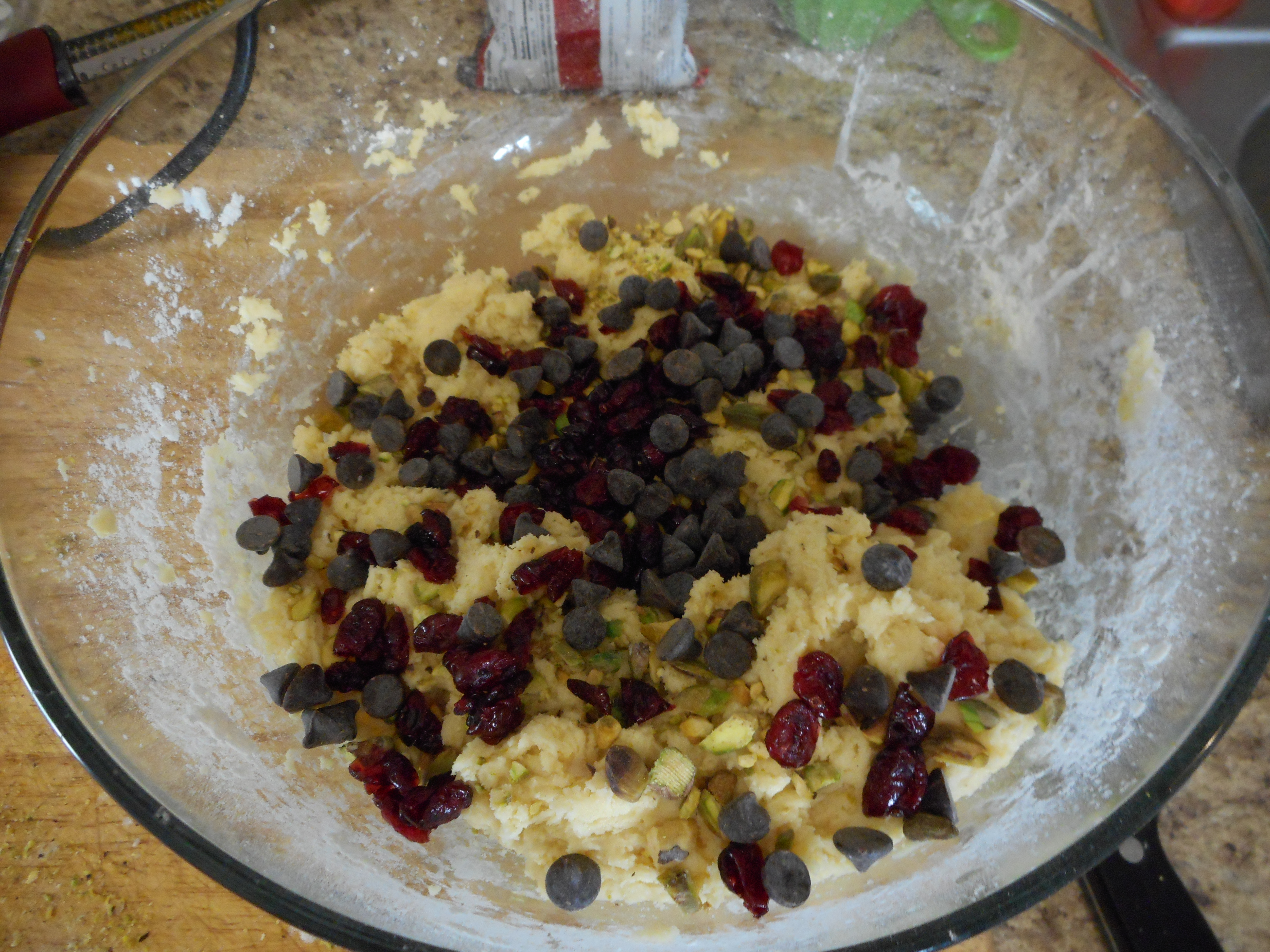 Add the pistachios, cranberries, and chocolate chips….