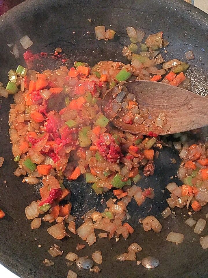Add in tomato paste and coat vegetables….