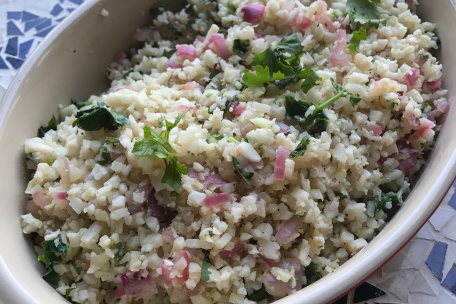 *Note* You can make your own cauliflower rice by taking cauliflower florets from a large head of cauliflower, cutting away as much stem as possible and in 3 batches, break up the florets into a food processor and pulse until the mixture resembles couscous. OR you can just buy premade Cauliflower Rice; Trader Joe’s has the best.
