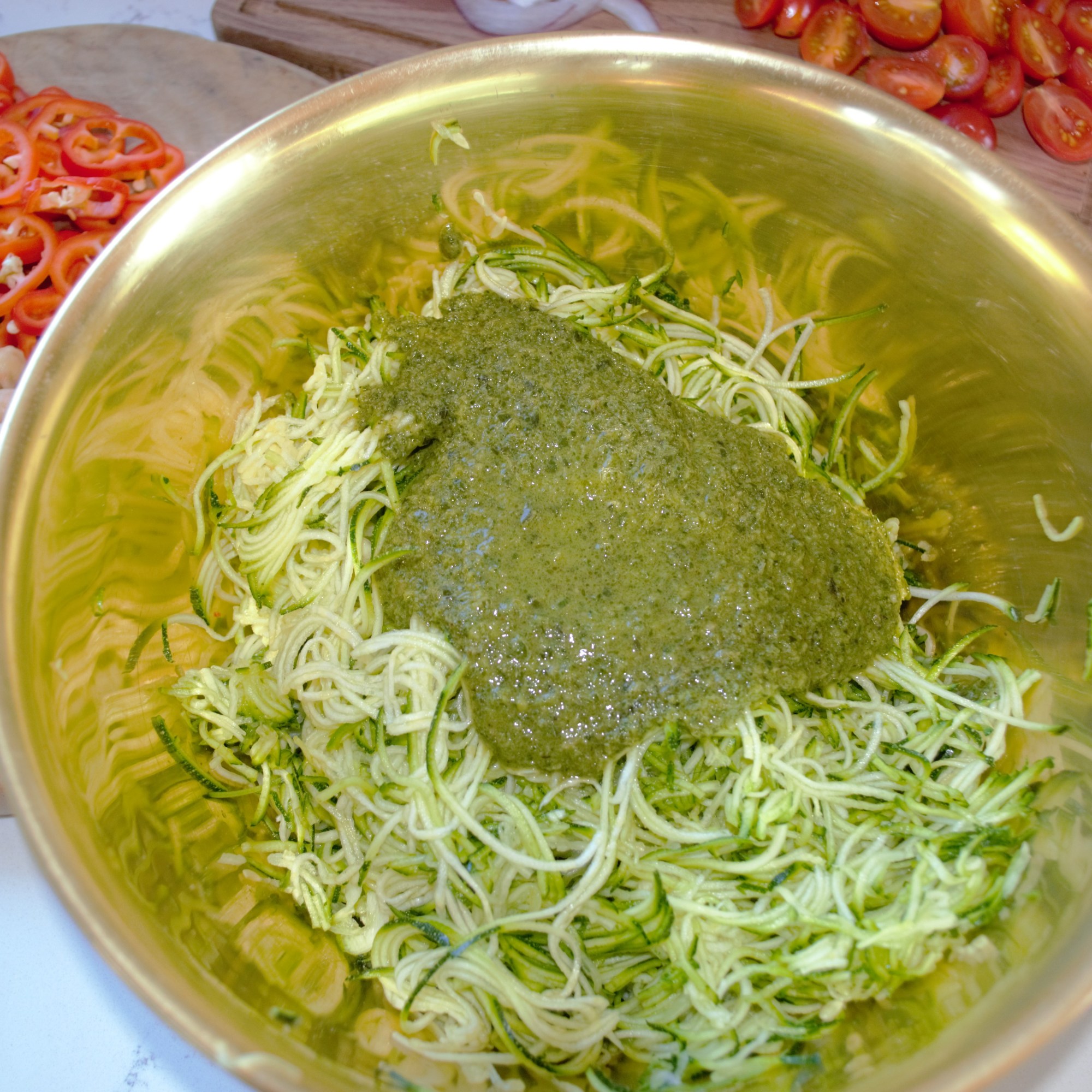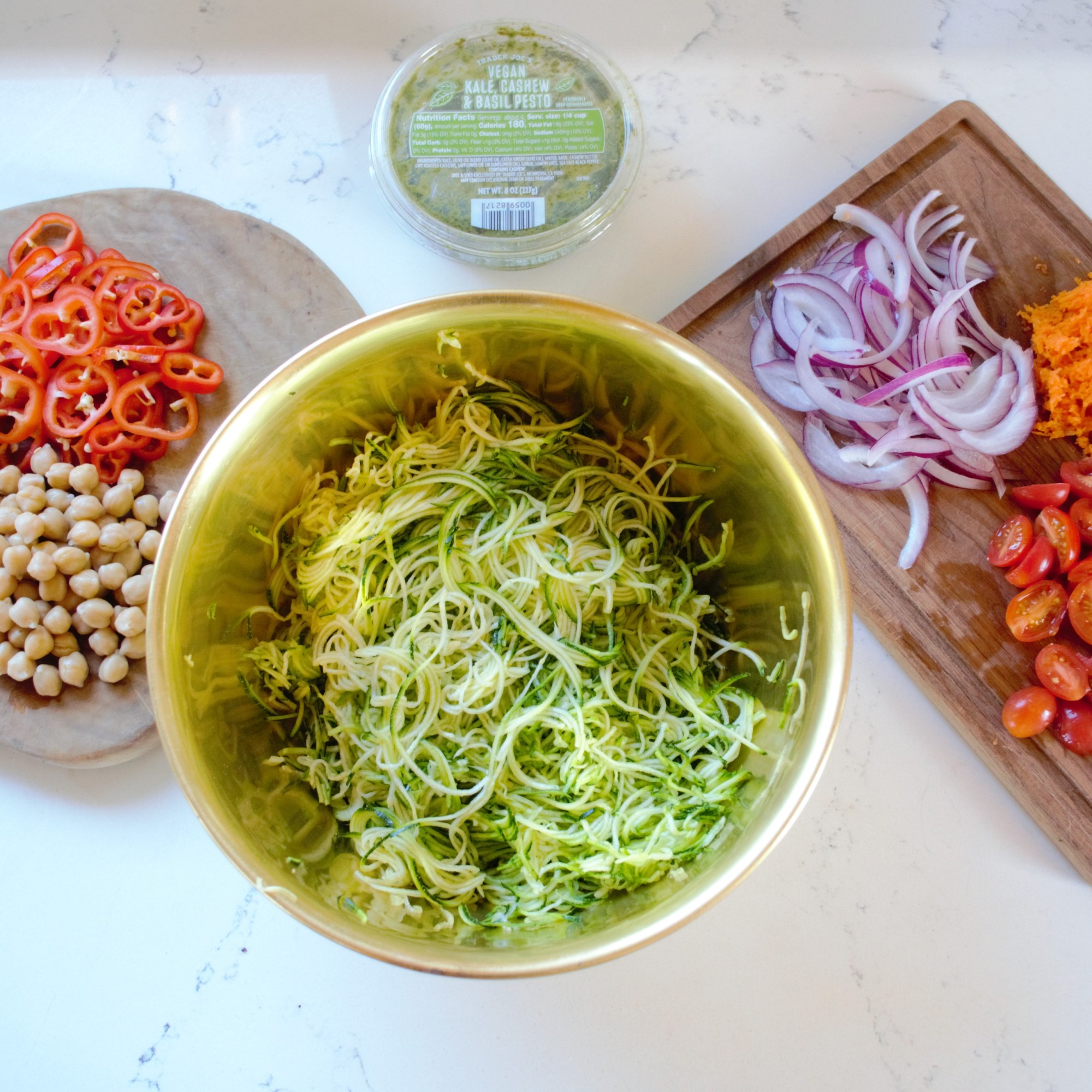 Spiralize the zucchini and spread the noodles out on a baking sheet. Sprinkle the noodles with the salt and allow to sit for 30 minutes. The salt will draw excess water out of the zucchini. Squeeze the noodles over a strainer in the sink until most of the water is released. Place the noodles in a large bowl. Add the pesto and toss well. Add remaining ingredients and toss well again. Serve and enjoy!