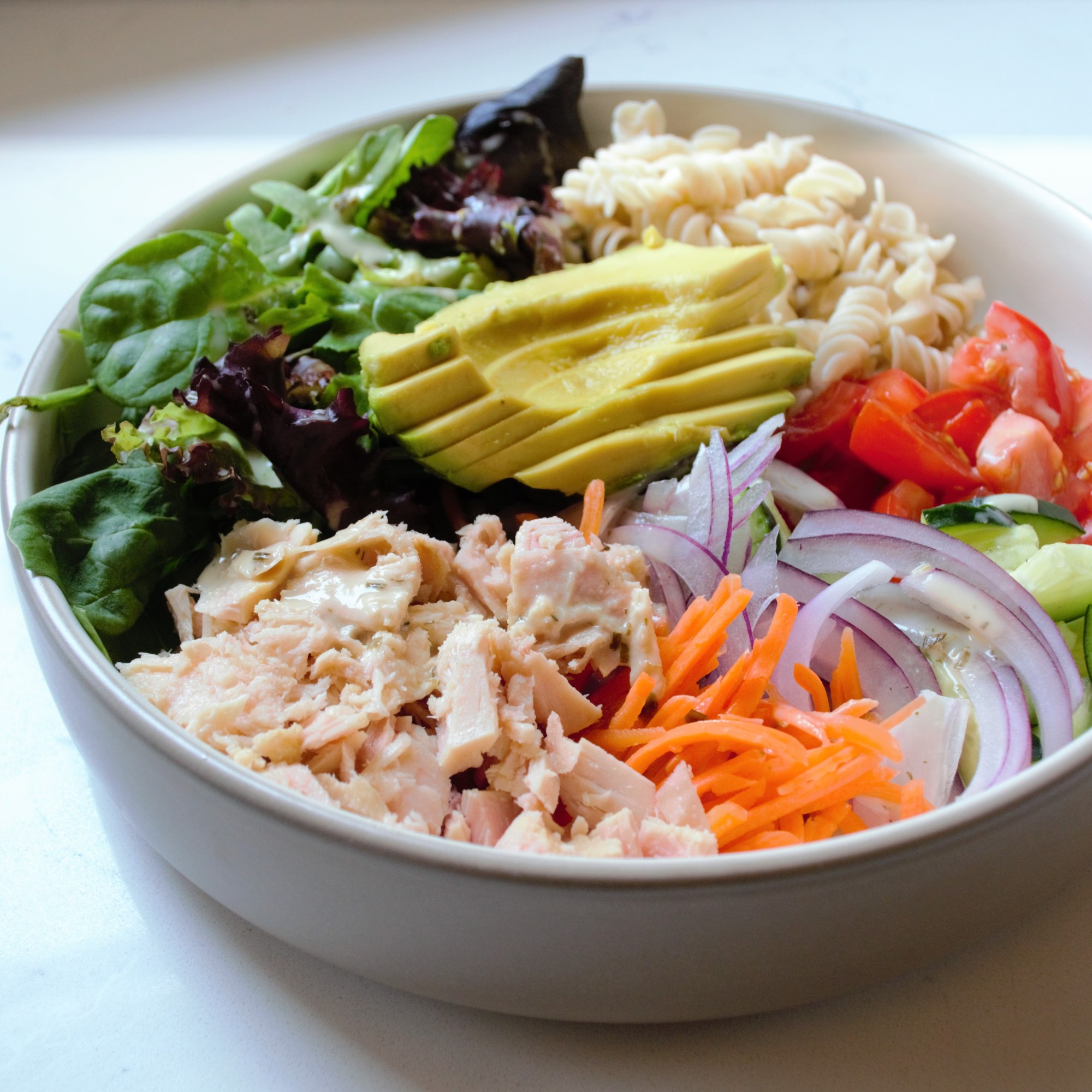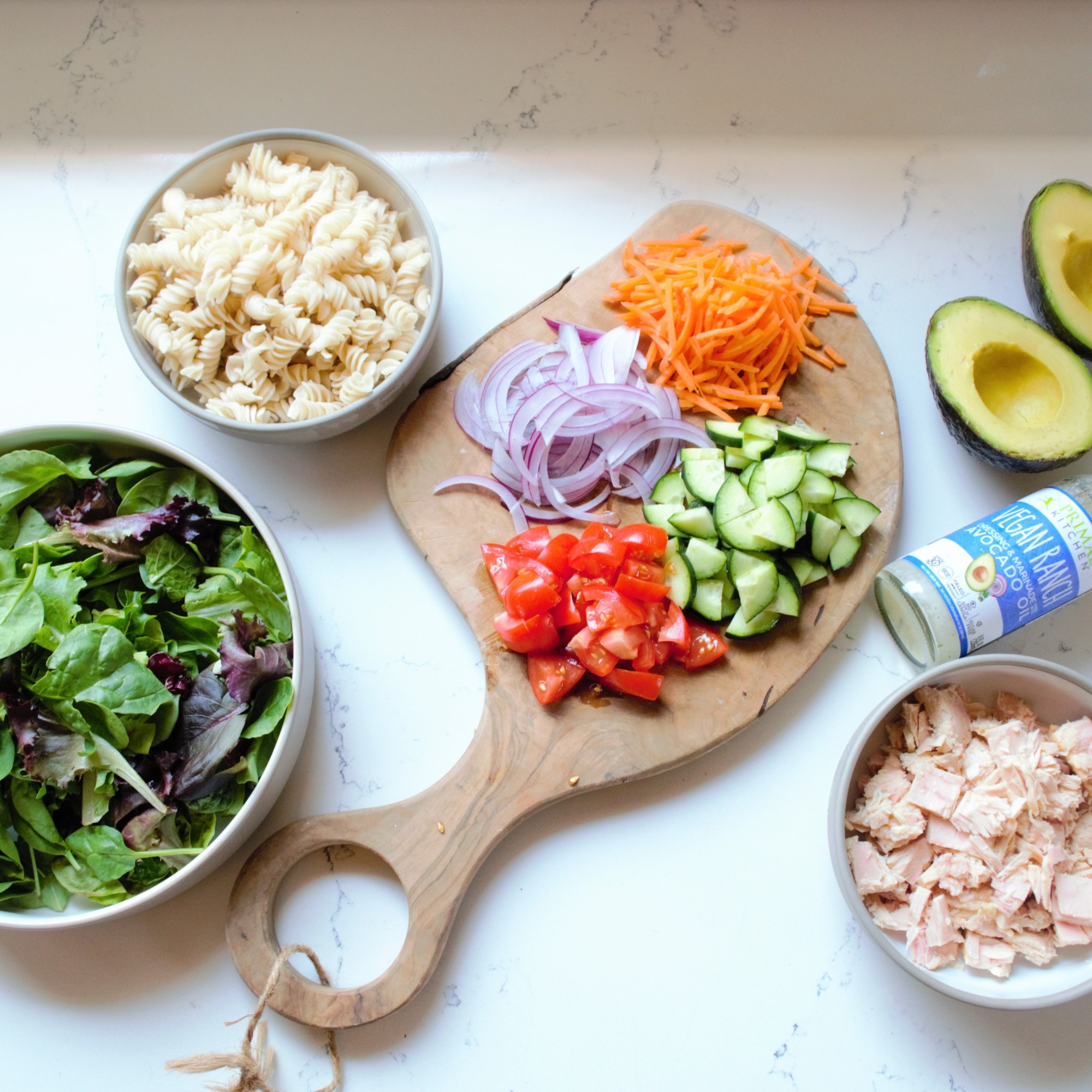 Assemble ingredients tuna through pasta side by side in a large bowl.  Drizzle with Primal Kitchen Ranch Dressing.  Top with avocado.  Eat and enjoy!