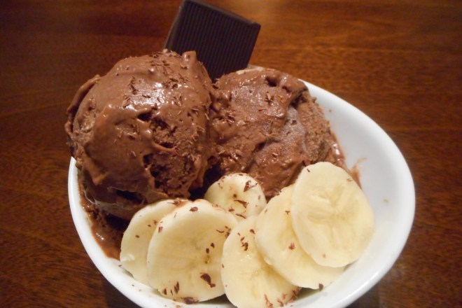 Pulse the frozen banana pieces in a food processor until blended and resembling vanilla ice cream. This can take some time and you may need to scrape down the sides of the bowl, so be patient.
